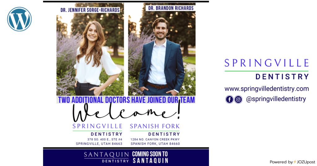 Exciting News! We are happy to introduce two dentists now at Spanish Fork Dentistry. Dr. Brandon Richards and Dr. Jennifer Sorge-Richards. Two highly regarded individuals and highly credentialed dentists. We are thrilled to have them as a part of our team! Welcome Dr. Richards and Dr. Sorge-Richards. @spanishforkdentistry @springvilledentistry #dentist #doctor CLICK ON EACH ICON TO SEE THIS POSTON EACH SOCIAL MEDIA PLATFORM Powered by⚡JOZUpost