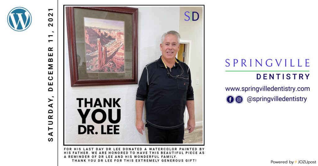 Dr David Lee will be retiring from Springville Dentistry and today is his last day. We want to thank him for all he has done for us and our patients. His place in our practice has been a tremendous blessing. We will miss him and wish him the very best as he enjoys his life of retirement. For his last day Dr Lee donated a watercolor painted by his father. We are honored to have this beautiful piece as a reminder of Dr Lee and his wonderful family. Thank you Dr Lee for this extremely generous