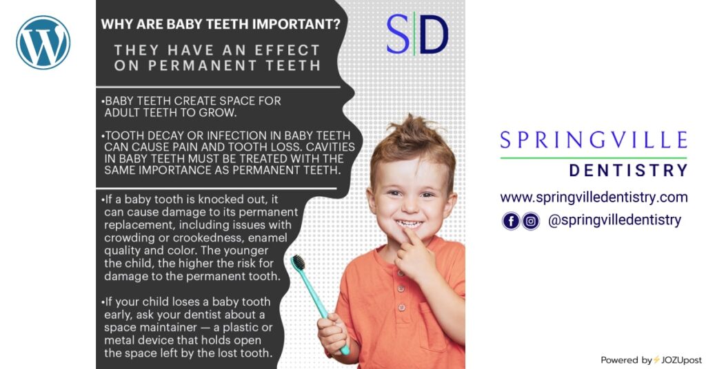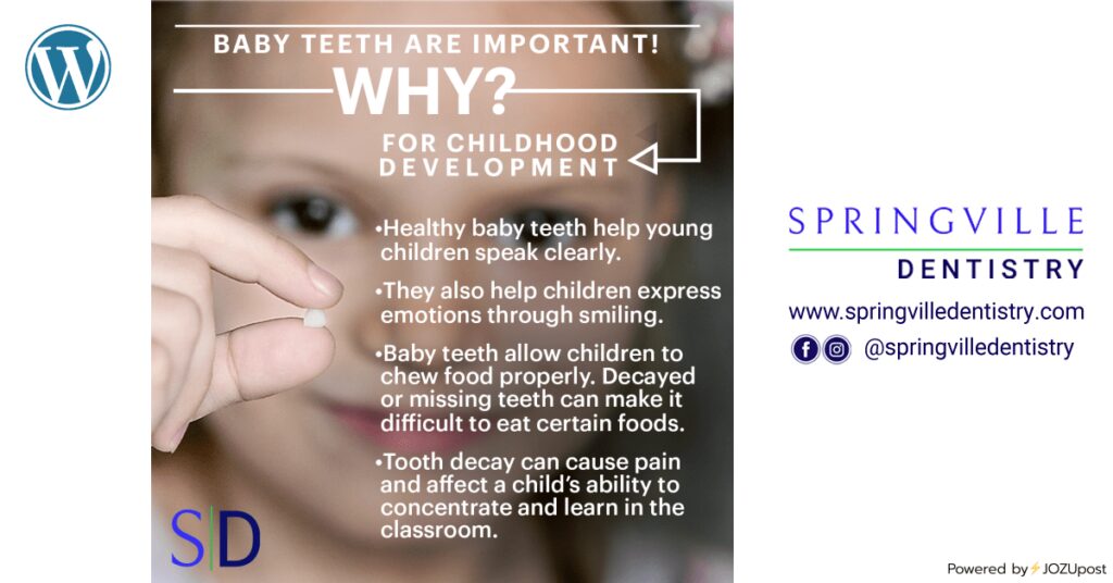 Baby teeth are important for childhood development. * Healthy baby teeth help young children speak clearly. * They also help children express emotions through smiling. * Baby teeth allow children to chew properly. Decayed or missing teeth can make it difficult to eat certain foods. * Tooth decay can cause pain and affect a child’s ability to concentrate and learn in the classroom CLICK ON EACH ICON TO SEE THIS POSTON EACH SOCIAL MEDIA PLATFORM Powered by⚡JOZUpost