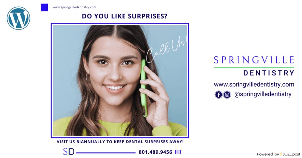 You may like a birthday surprise, but no one likes DENTAL SURPRISES! Come and see us at Springville Dentistry biannually for your checkups and cleanings. It is always better to plan and be prepared, and to see problem areas before they get too bad for repair. While some dental problems are unforeseeable, most can be prevented or addressed before they have a chance to take you by surprise. Call Us 801-489-9456 or schedule online www.springvilledentistry.com #dentalcheckup