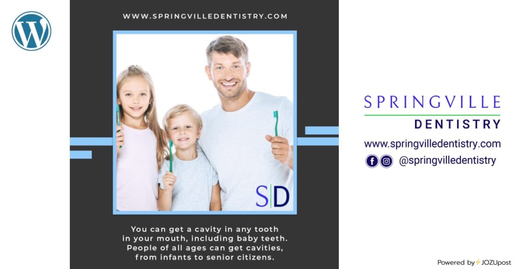 You can get a cavity in any tooth in your mouth, including baby teeth. People of all ages can get cavities, from infants to senior citizens. If you suspect you have a cavity, call us at Springville Dentistry to schedule a checkup or exam consultation appointment with one of the doctors. It’s better to catch a cavity in it’s early stages before the damage is too severe and causes undue pain and expenses. #cavities #caries CLICK ON EACH ICON TO SEE THIS POSTON EACH SOCIAL MEDIA
