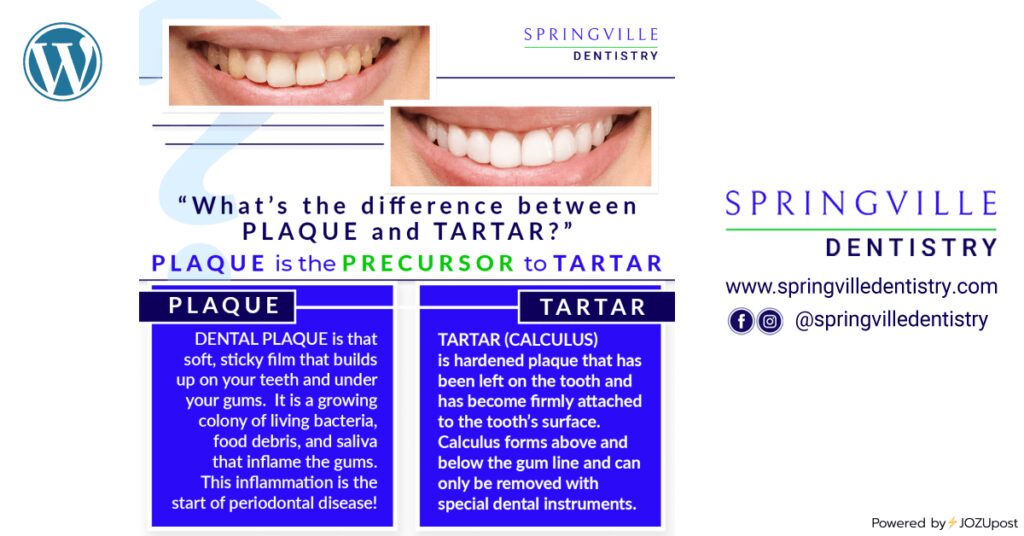 Plaque vs. Tartar? — •You may think that your daily habit of brushing and flossing is enough to keep your teeth healthy, but a professional cleaning by one of our expert dental hygienists to scrape away tartar and remove plaque from below the gum line. — •Plaque forms constantly on your teeth and is a sticky film that can harden and become tartar (which is also called calculus), a much harder substance if it’s not cleaned away. Plaque is soft and can be removed from the surface of your teeth by