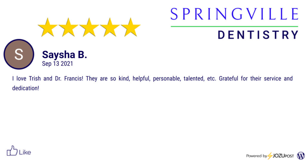 We appreciate our patients! Here is our latest Five-Star Review from Saysha B. We love to recognize those patients that take the time to fill out a review and let us know how we are doing. Here is what Saysha B. had to say: "I love Trish and Dr. Francis! They are so kind, helpful, personable, talented, etc. Grateful for their service and dedication!" Thank you, Saysha B.! We look forward to seeing you again at your next dental appointment! We at Springville Dentistry try to respond to all