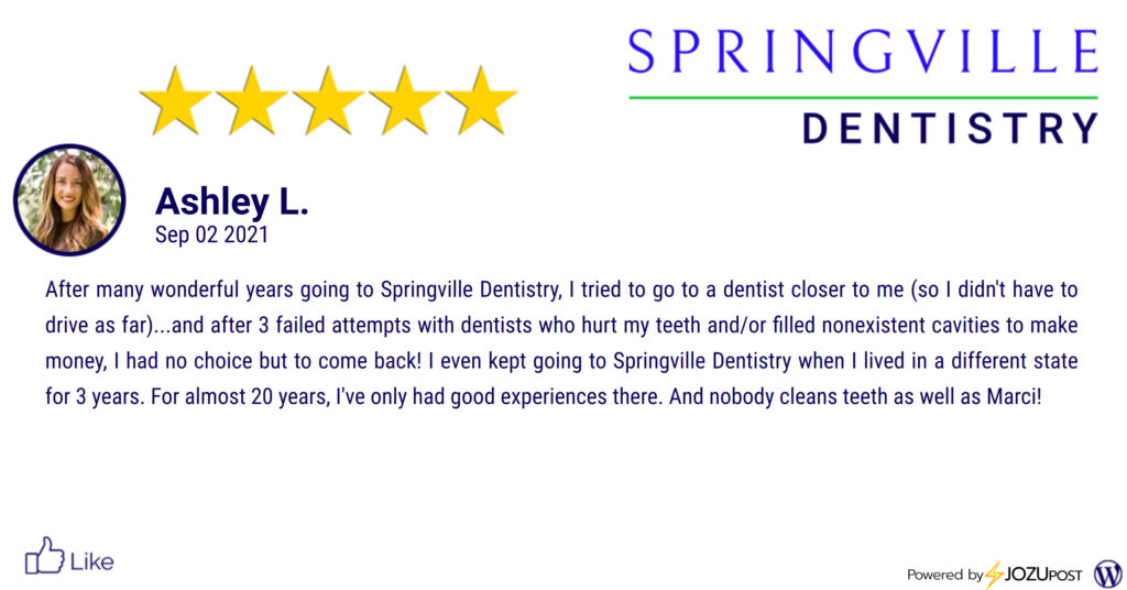 We appreciate our patients! Here is our latest Five-Star Review from Ashley L. We love to recognize those patients that take the time to fill out a review and let us know how we are doing. Here is what Ashley L. had to say: "After many wonderful years going to Springville Dentistry, I tried to go to a dentist closer to me (so I didn't have to drive as far)...and after 3 failed attempts with dentists who hurt my teeth and/or filled nonexistent cavities to make money, I had no choice but to