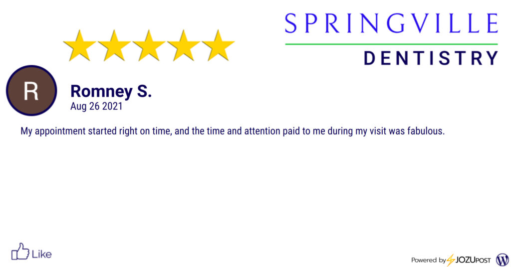 We appreciate our patients! Here is our latest Five-Star Review from Romney S. We love to recognize those patients that take the time to fill out a review and let us know how we are doing. Here is what Romney S. had to say: "My appointment started right on time, and the time and attention paid to me during my visit was fabulous." Thank you, Romney S.! We look forward to seeing you again at your next dental appointment! We at Springville Dentistry try to respond to all the customer feedback