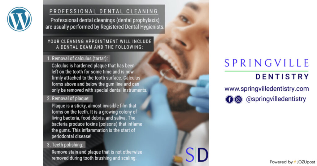 Dental cleanings (Dental Prophylaxis) are performed by one of our skilled and friendly Dental Hygienists. Your cleaning appointment will include a dental exam and the following: •Removal of calculus (Tartar): Calculus is hardened plaque that has been left on the tooth for some time and is now firmly attached to the tooth surface. Calculus forms above and below the gum line and can only be removed with special dental instruments. •Removal of plaque: Plaque is a sticky, almost invisible film