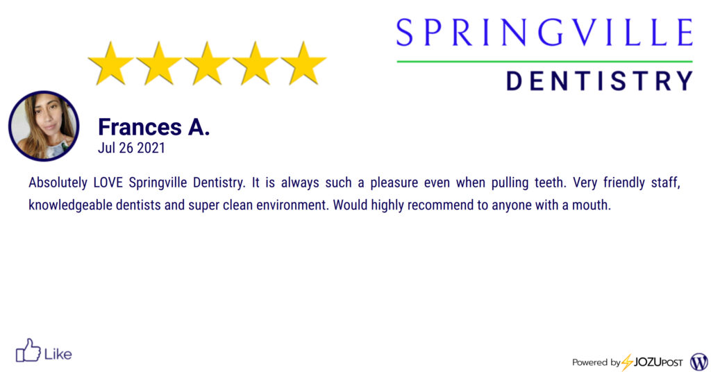 We appreciate our patients! Here is our latest Five-Star Review from Frances A. We love to recognize those patients that take the time to fill out a review and let us know how we are doing. Here is what Frances A. had to say: "Absolutely LOVE Springville Dentistry. It is always such a pleasure even when pulling teeth. Very friendly staff, knowledgeable dentists and super clean environment. Would highly recommend to anyone with a mouth." Thank you, Frances A.! We look forward to seeing you