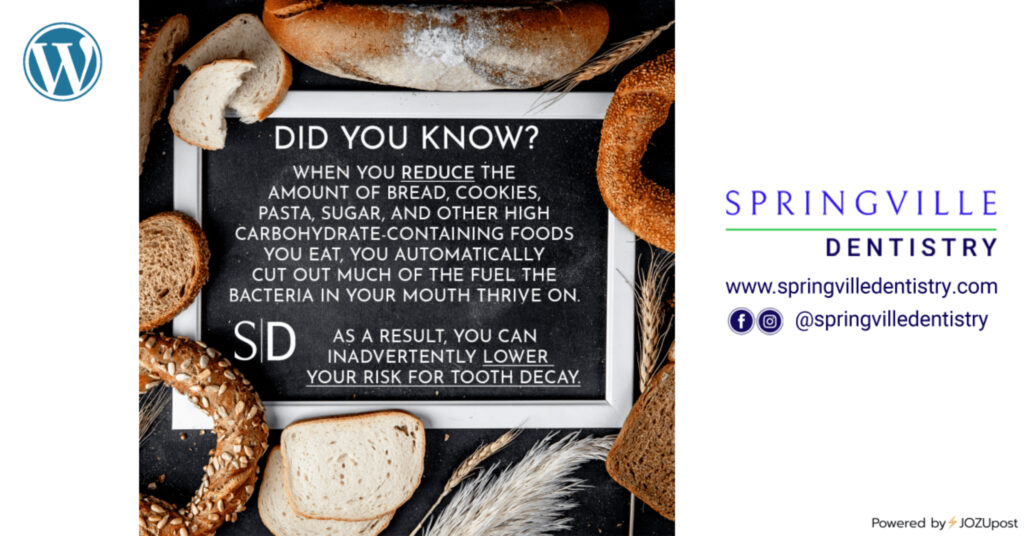DID YOU KNOW? When you reduce the amount of bread, cookies, pasta, sugar, and other high carbohydrate-containing foods you eat, you automatically cut out much of the fuel the bacteria in your mouth thrive on. As a result, you can inadvertently lower your risk for tooth decay. • • • • • #carbohydrates #sugar CLICK ON EACH ICON TO SEE THIS POST ON EACH SOCIAL MEDIA PLATFORM Powered by⚡JOZUpost