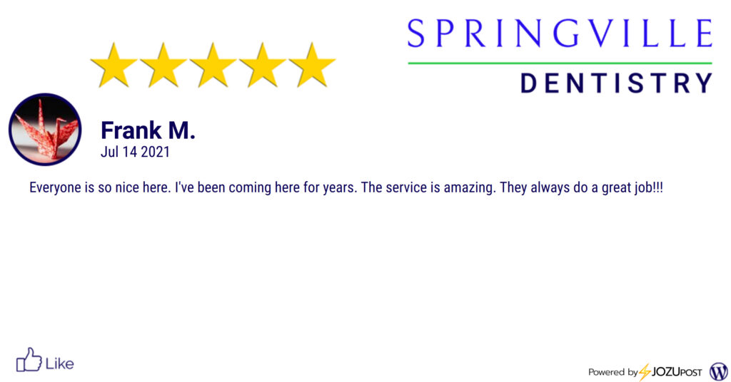 We appreciate our patients! Here is our latest Five-Star Review from Frank M. We love to recognize those patients that take the time to fill out a review and let us know how we are doing. Here is what Frank M. had to say: "Everyone is so nice here. I've been coming here for years. The service is amazing. They always do a great job!!!" Thank you, Frank M.! We look forward to seeing you again at your next dental appointment! We at Springville Dentistry try to respond to all the customer