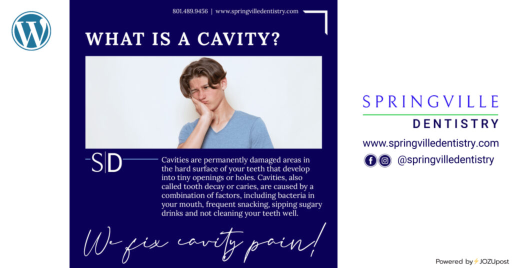 WHAT IS A CAVITY? Cavities are permanently damaged areas in the hard surface of your teeth that develop into tiny openings or holes. Cavities, also called tooth decay or caries, are caused by a combination of factors, including bacteria in your mouth, frequent snacking, sipping sugary drinks and not cleaning your teeth well. ???????? Springville Dentistry can fix cavities, and any other of your dental concerns. Call us to set up an appointment! PH: 801489.9456 • • • • • • • #cavity