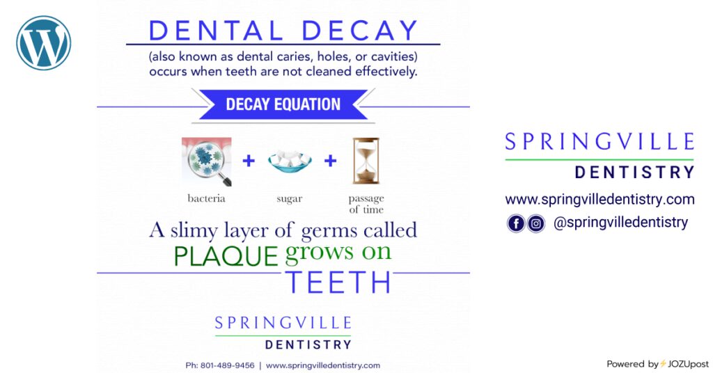 Dental Decay (also known as dental caries, holes, or cavities) occurs when teeth are not cleaned effectively. Decay Equation Bacteria + Sugar + Passage Of Time = A slimy layer of germs called plaque grows on teeth. #plaque #dentaldecay CLICK ON EACH ICON TO SEE THIS POSTON EACH SOCIAL MEDIA PLATFORM Powered by⚡JOZUpost