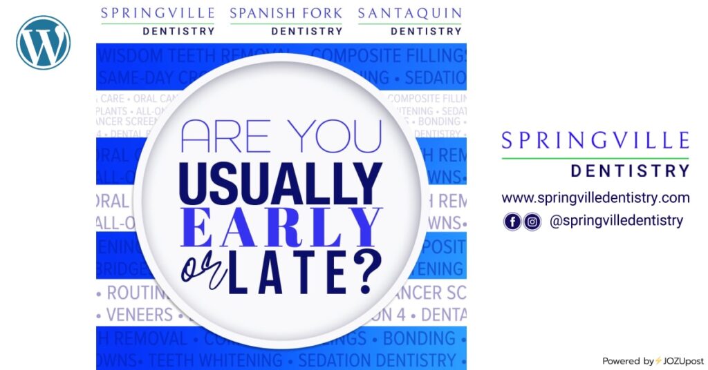 What do you think? Has it become socially acceptable to be late for an appointment? Are you always early, late or perfectly punctual? @spanishforkdentistry @santaquindentistry #beontime #respect CLICK ON EACH ICON TO SEE THIS POSTON EACH SOCIAL MEDIA PLATFORM Powered by⚡JOZUpost