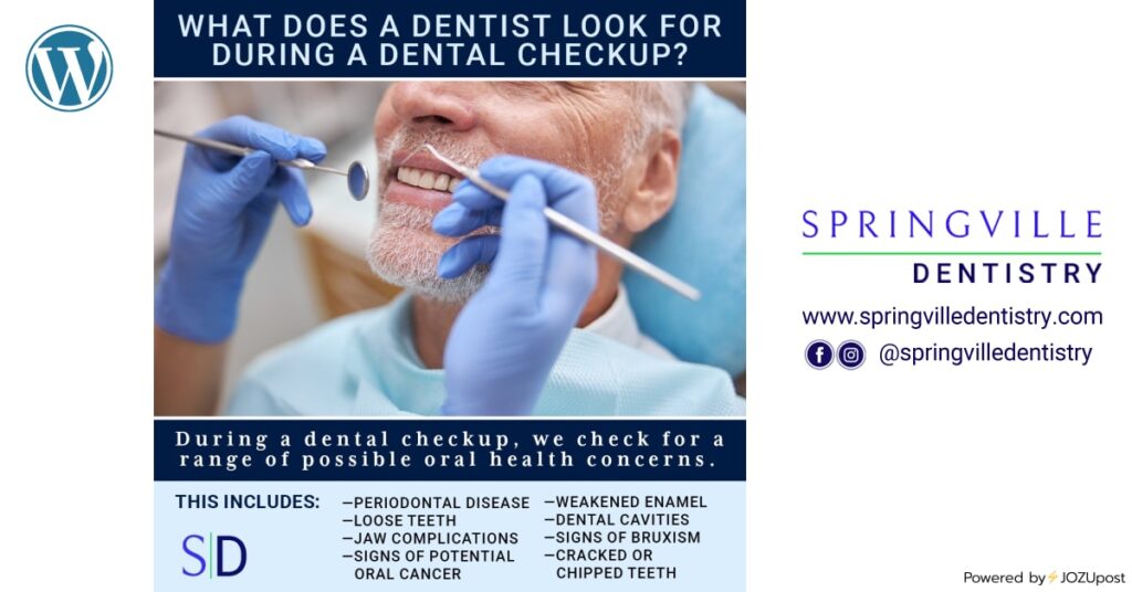 When was your last dental checkup? A dental checkup is a visit with a dental professional for the purpose of reviewing the patient’s oral health. What does a dentist look for during a dental checkup? The dentist checks for a range of possible oral health concerns. This includes (but is not limited to): Weakened enamel Dental cavities Cracked or chipped teeth Signs of bruxism Periodontal disease Loose teeth Jaw complications Signs of potential oral