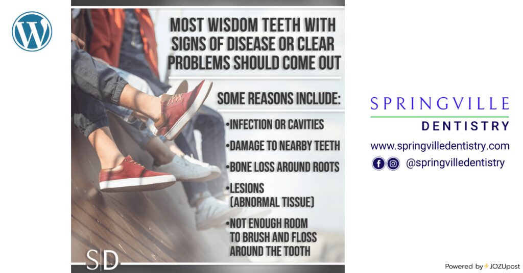 Most wisdom teeth with signs of disease or clear problems should come out. Some Reasons include: •Infection or cavities •Damage to nearby teeth •Bone loss around roots •Lesions (abnormal tissue) •Not enough room to brush and floss around the tooth #wisdomteeth #teenlife CLICK ON EACH ICON TO SEE THIS POSTON EACH SOCIAL MEDIA PLATFORM Powered by⚡JOZUpost