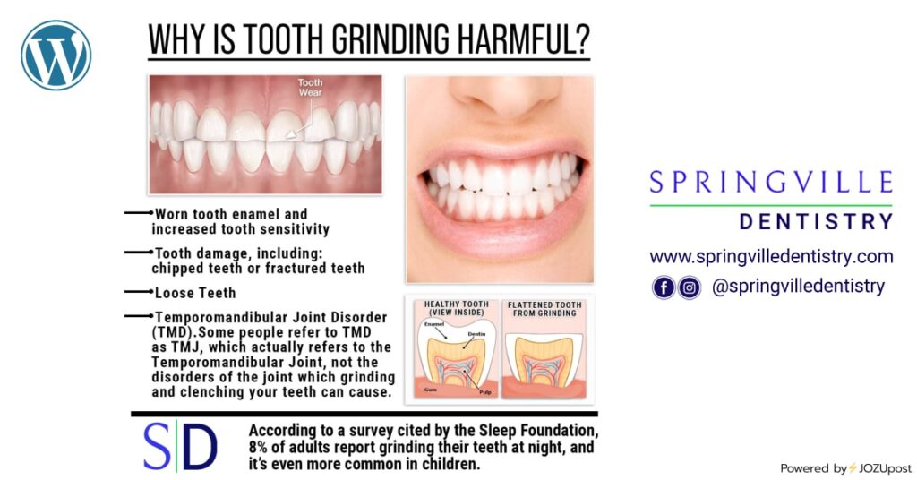 Why Is Tooth Grinding Harmful? Jaw pain or dull headaches are common, unpleasant signs of bruxism. Left untreated, grinding your teeth can also have devastating effects on your oral health: • Worn tooth enamel and increased tooth sensitivity • Tooth damage, including chipped teeth or fractured teeth • Loose teeth • Temporomandibular joint disorder (TMD). Some people refer to TMD as TMJ, which actually refers to the Temporomandibular