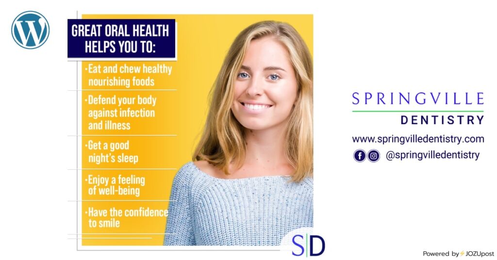 Great oral health helps you to: • Eat and chew healthy nourishing foods • Defend your body against infection and illness • Get a good night’s sleep • Enjoy a feeling of well-being • Have the confidence to smile Springville Dentistry | 801-489-9456 | www.SpringvilleDentistry.com #healthysmile #oralhealth CLICK ON EACH ICON TO SEE THIS POSTON EACH SOCIAL MEDIA PLATFORM Powered by⚡JOZUpost