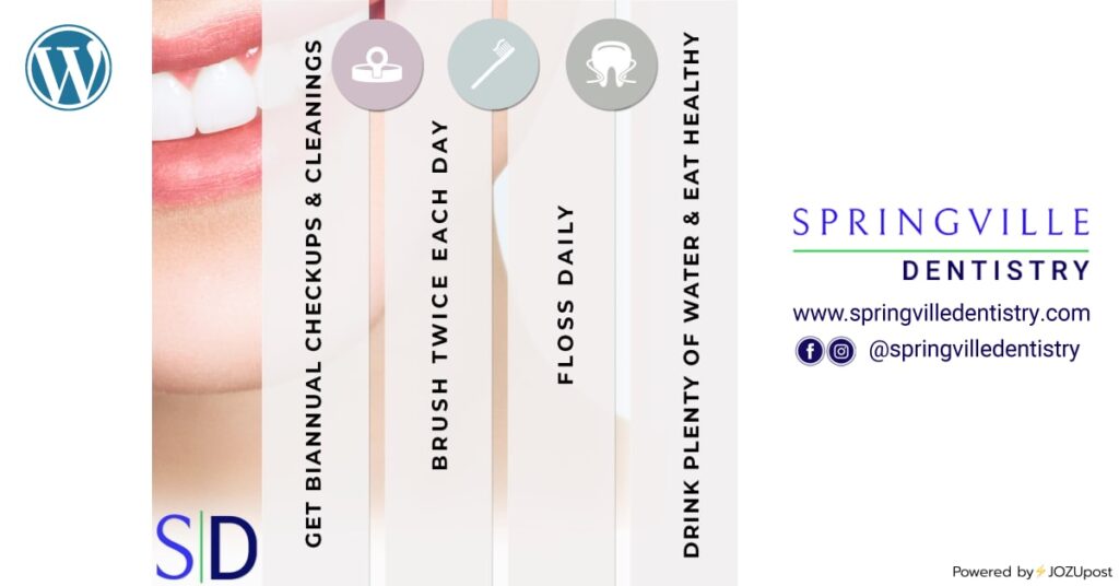 4 Good Habits For a Healthy Smile: 1. Consistently visit your dentist biannually 2. Brush twice each day 3. Floss everyday 4. Drink plenty of water and eat healthy #preventativecare #oralhealth CLICK ON EACH ICON TO SEE THIS POSTON EACH SOCIAL MEDIA PLATFORM Powered by⚡JOZUpost