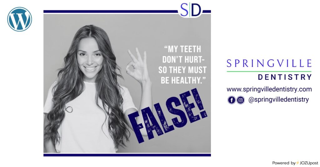 “My teeth don’t hurt - so they must be healthy! False!!! Call Springville Dentistry today for a professional checkup and dental cleaning today. 801-489-9456 | www.springvilledentistry.com #healthyteeth #dentalcheckup CLICK ON EACH ICON TO SEE THIS POSTON EACH SOCIAL MEDIA PLATFORM Powered by⚡JOZUpost
