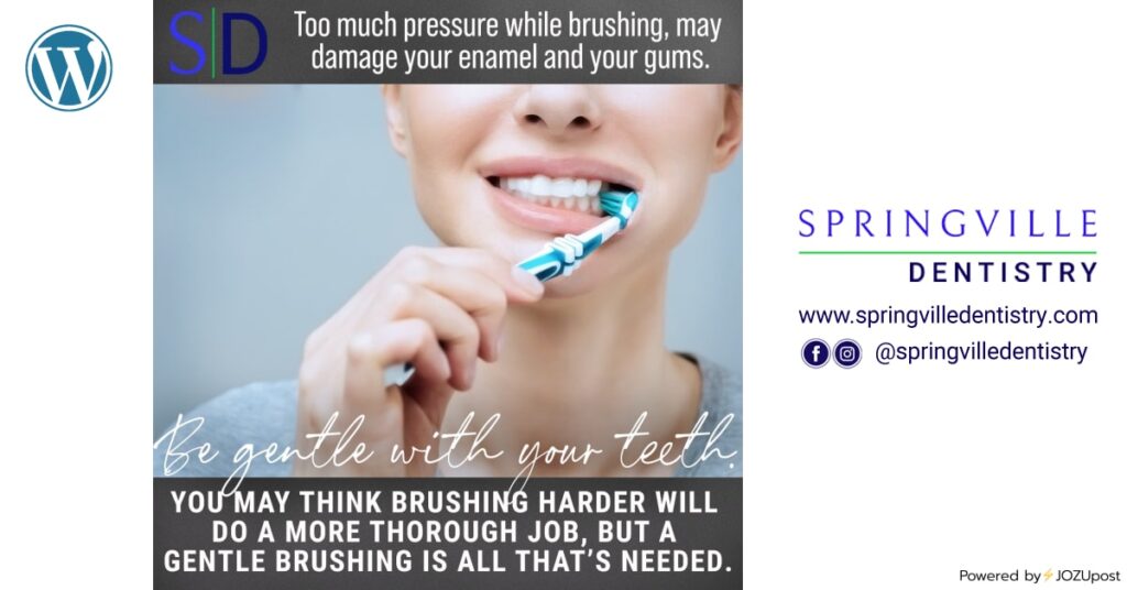 When we brush our teeth, most of us aren’t kind to our teeth. You might not realize that not brushing your teeth gently and carefully could damage both your gums and teeth. www.springvilledentistry.com #healthyteeth #dentalcheckup