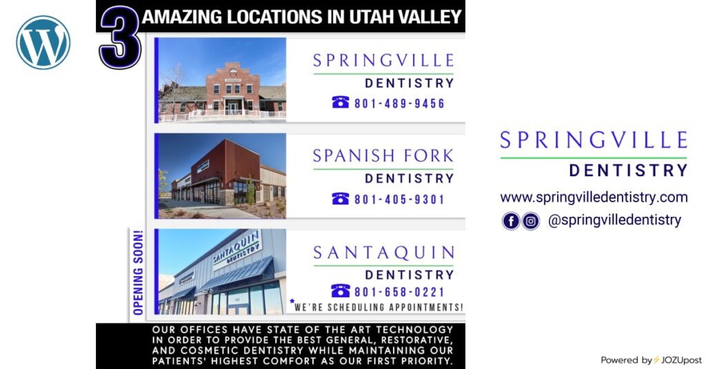 Exciting News: we have started scheduling appointments for patients at our Santaquin Dentistry office. Call 801-658-0221 CLICK ON EACH ICON TO SEE THIS POSTON EACH SOCIAL MEDIA PLATFORM Powered by⚡JOZUpost