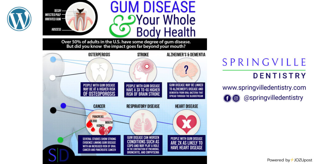 Oral health maintenance and periodontal interventions may reduce risks of diabetes, and cardiovascular and pulmonary disease. An emerging body of evidence linking oral disease and systemic disease underscores the necessity of collaborative patient care. Individuals with periodontal disease also have a higher risk of the following conditions: Osteoporosis, Stroke, Alzheimers & Dementia, Cancer, Respiratory Disease, and Heart Disease. Good oral hygiene is an important component to maintain a