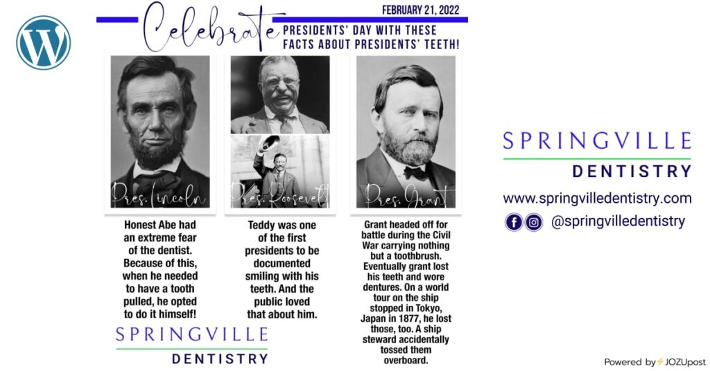 Presidents' Day with these Facts about Presidents’ Teeth! President Lincoln: Honest Abe had an extreme fear of the dentist. Because of this, when he needed to have a tooth pulled, he opted to do it himself! President Roosevelt: Teddy was one of the first presidents to be documented smiling with his teeth. And the public loved that about him. President Grant: Grant headed off for battle during the Civil War carrying nothing but a toothbrush. Eventually grant lost his teeth and wore dentures.
